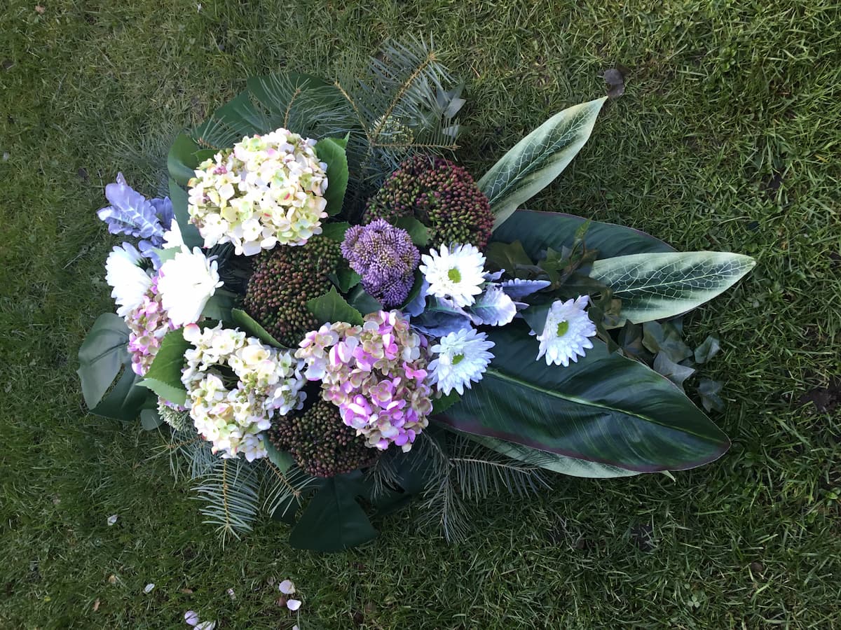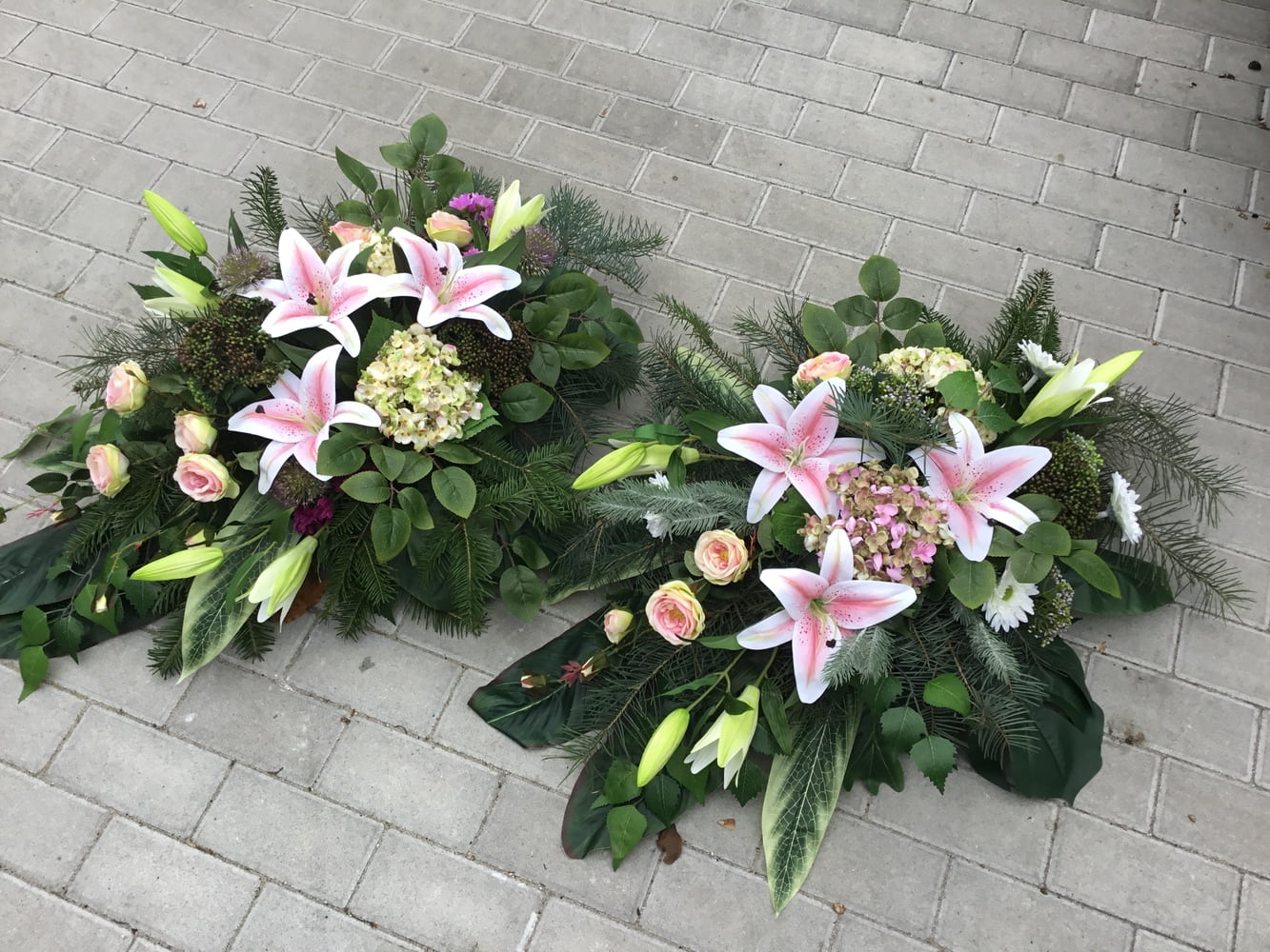 Zrobione z żywych lub sztucznych kwiatów, w zależności od życzeń klienta i pory roku. Cena w zależności od rodzaju i wielkości kompozycji aranżacje na trumnę od 500 zł.